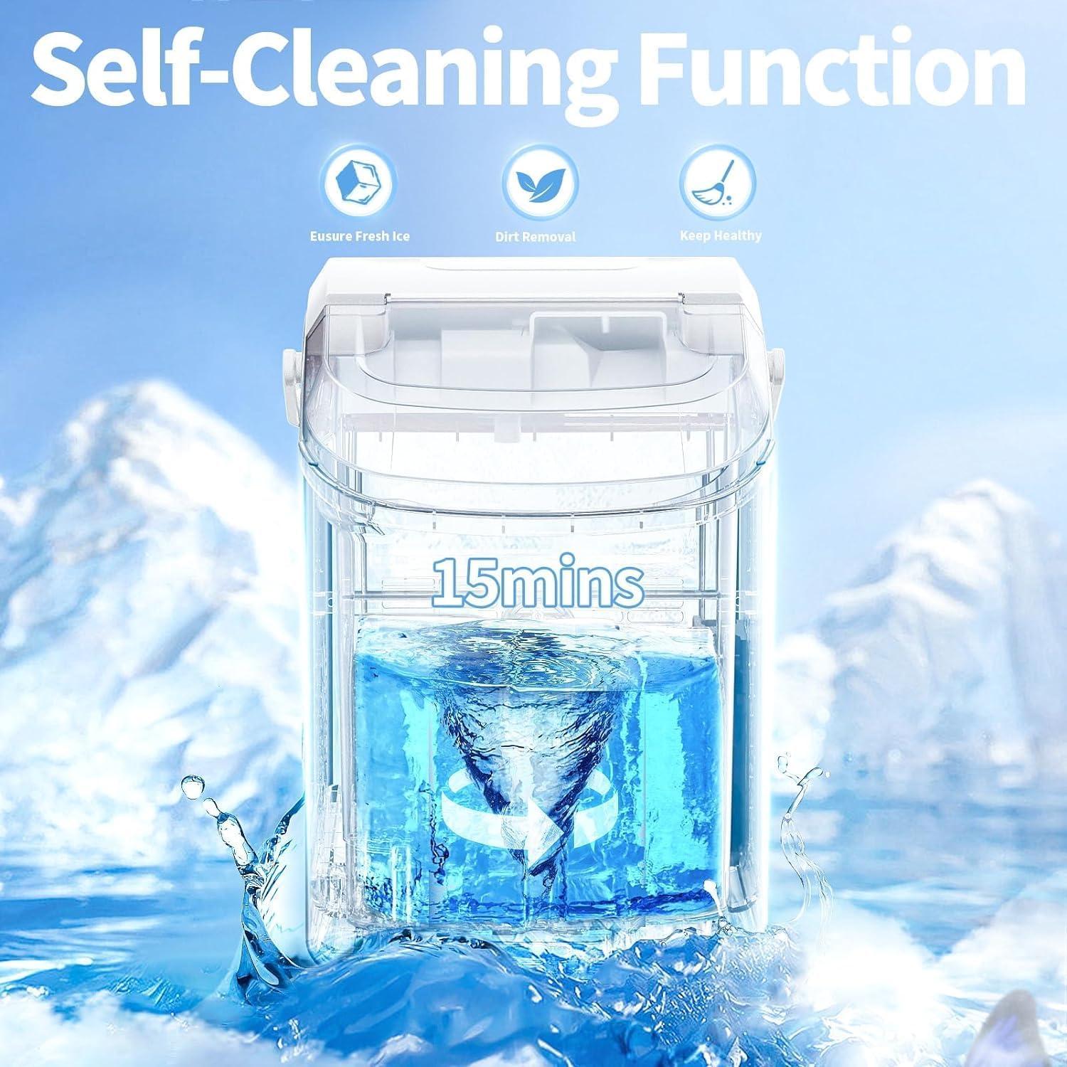 QUIET AND USER FRIENDLY: It makes ice with low noise. The transparent lid allows you to monitor the ice making process. A considerate ice scoop holder, easy to find your ice scoop before making ice. Only need to press one button, helps you to quickly understand how to use it. When the water is insufficient or the ice basket is full, the indicator light will turn on.