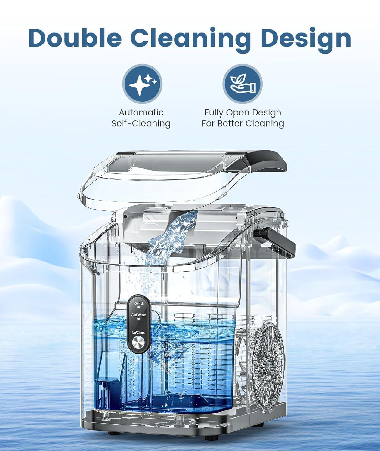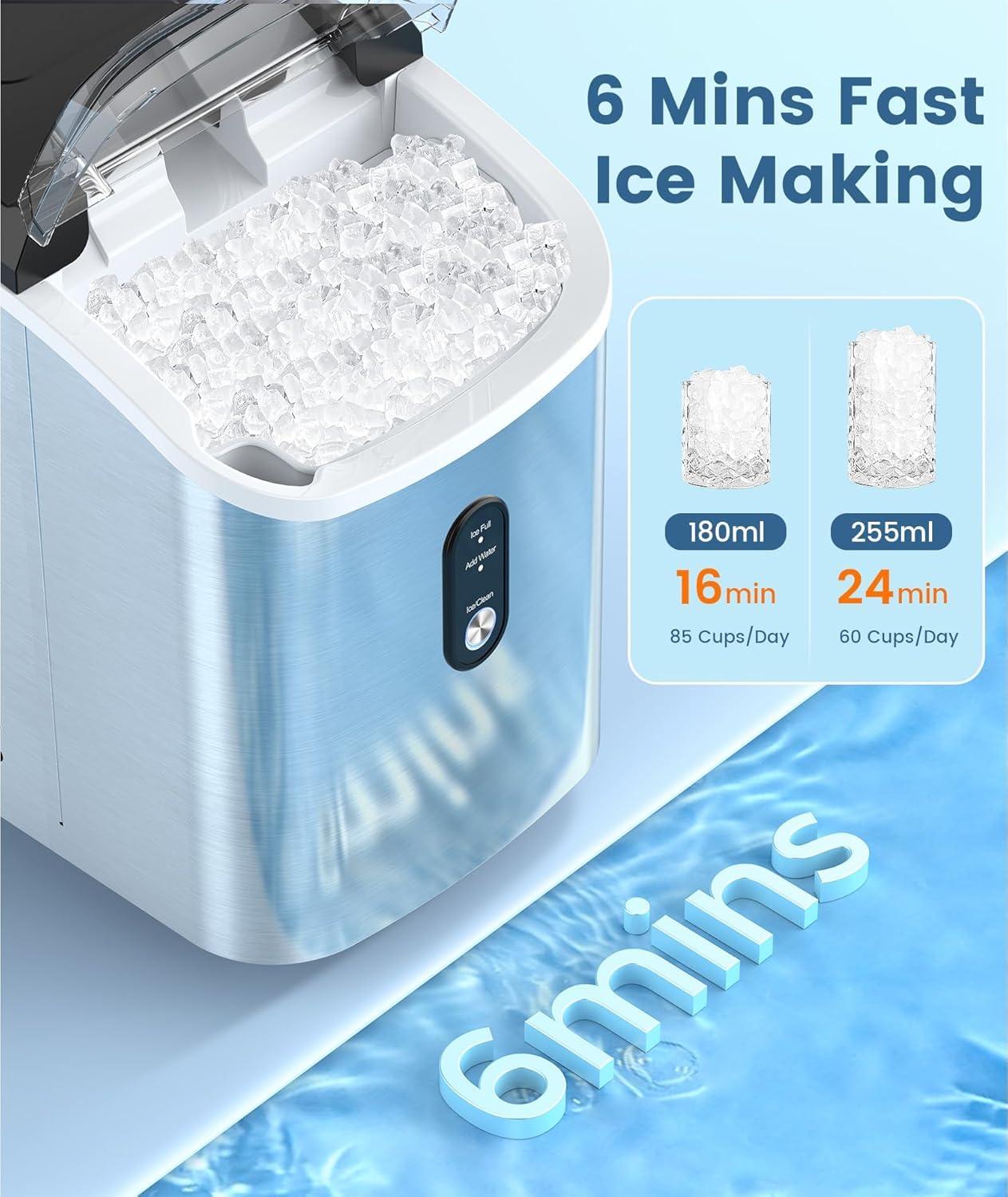 【6-Minute Quick Ice Making】 Our new ice maker produces your first batch of fresh ice in just 6 minutes. Simply add 1.1 liters of water to the Antarctic Star countertop ice maker's tank to make up to 34 pounds (approximately 15 kilograms) of crystal-clear ice in 24 hours. This easy-to-use pebble ice maker eliminates long wait times, allowing the whole family to enjoy coolness anytime.