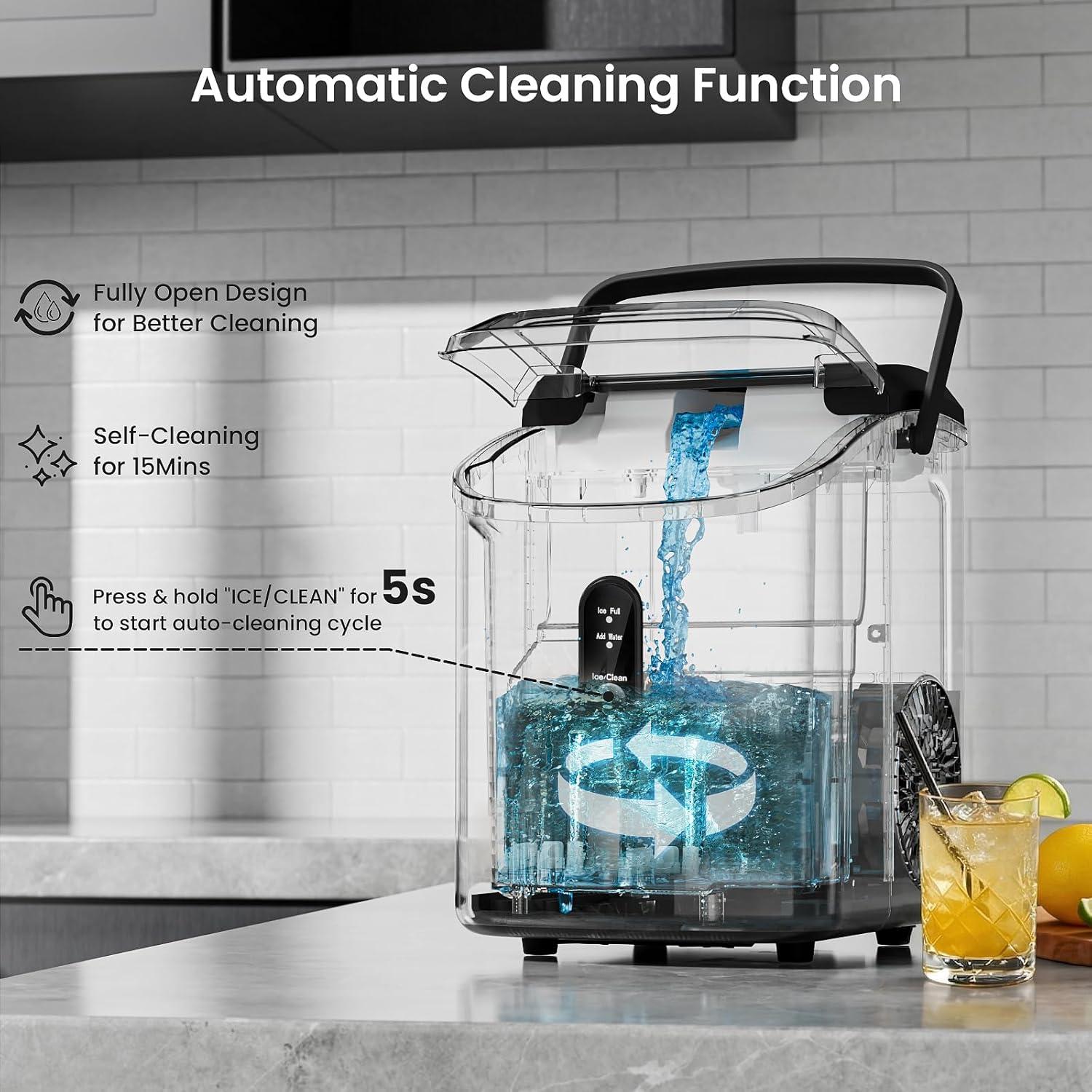 【6-Minute Quick Ice Making】 Our new ice maker produces your first batch of fresh ice in just 6 minutes. Simply add 1.1 liters of water to the Antarctic Star countertop ice maker's tank to make up to 34 pounds (approximately 15 kilograms) of crystal-clear ice in 24 hours. This easy-to-use pebble ice maker eliminates long wait times, allowing the whole family to enjoy coolness anytime.