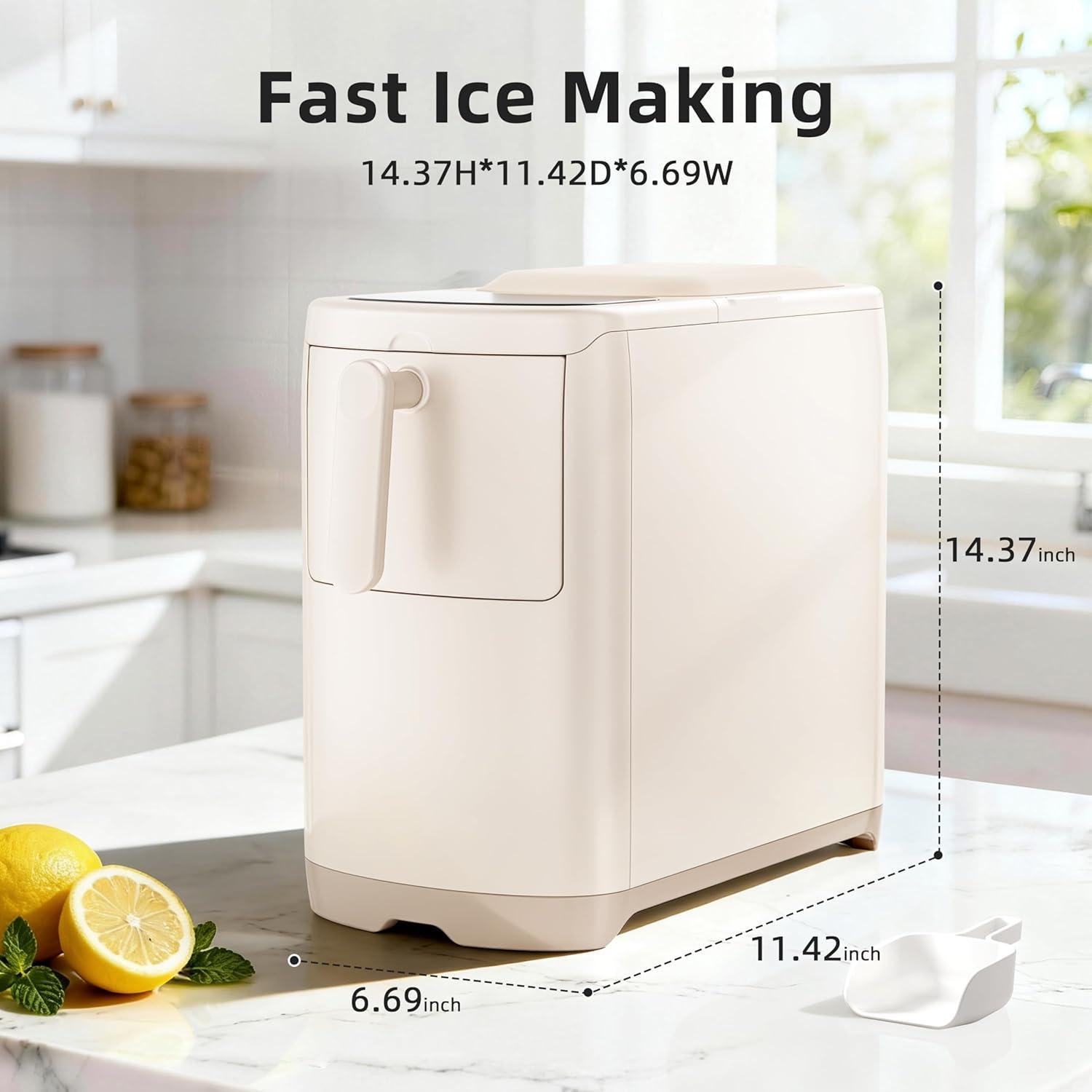【Compact Size with Ice Scoop Included】 With a space-saving design (14.37 × 11.42 × 6.69 inches) and included ice scoop, this ice maker fits perfectly on kitchen counters, offices, dorms, and RVs for effortless serving.